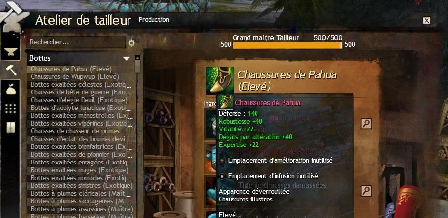 Alors, je ne suis pas trop sûr de savoir de quel PnJ on parle réellement (je ne vois pas de "Maître d'Arme"). Je vois bien le Maitre forgeron d'armes, mais j'imagine que ce n'est pas de lui dont on parle, vu que ce sont des armures de cuir que je souhaite crafter. Le maître tailleur de cuir me vend bien l'insigne entrelacée de maraudeur. Mais il ne vend pas les recettes d'armure associées à l'insigne. Et du coup c'est là que je bloque. (vu que ce n'est pas la recette élevée que je recherche mais le craft exotique).